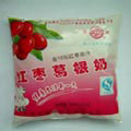 本包裝件適用于醬油、醋、果汁、牛奶等液體,采用0.08mm聚乙烯薄膜,其成型、制袋、定量灌裝、油墨印字、封口切斷等過程全部自動進(jìn)行,薄膜在包裝前進(jìn)行紫外線消毒,符合食品衛(wèi)生的要求。